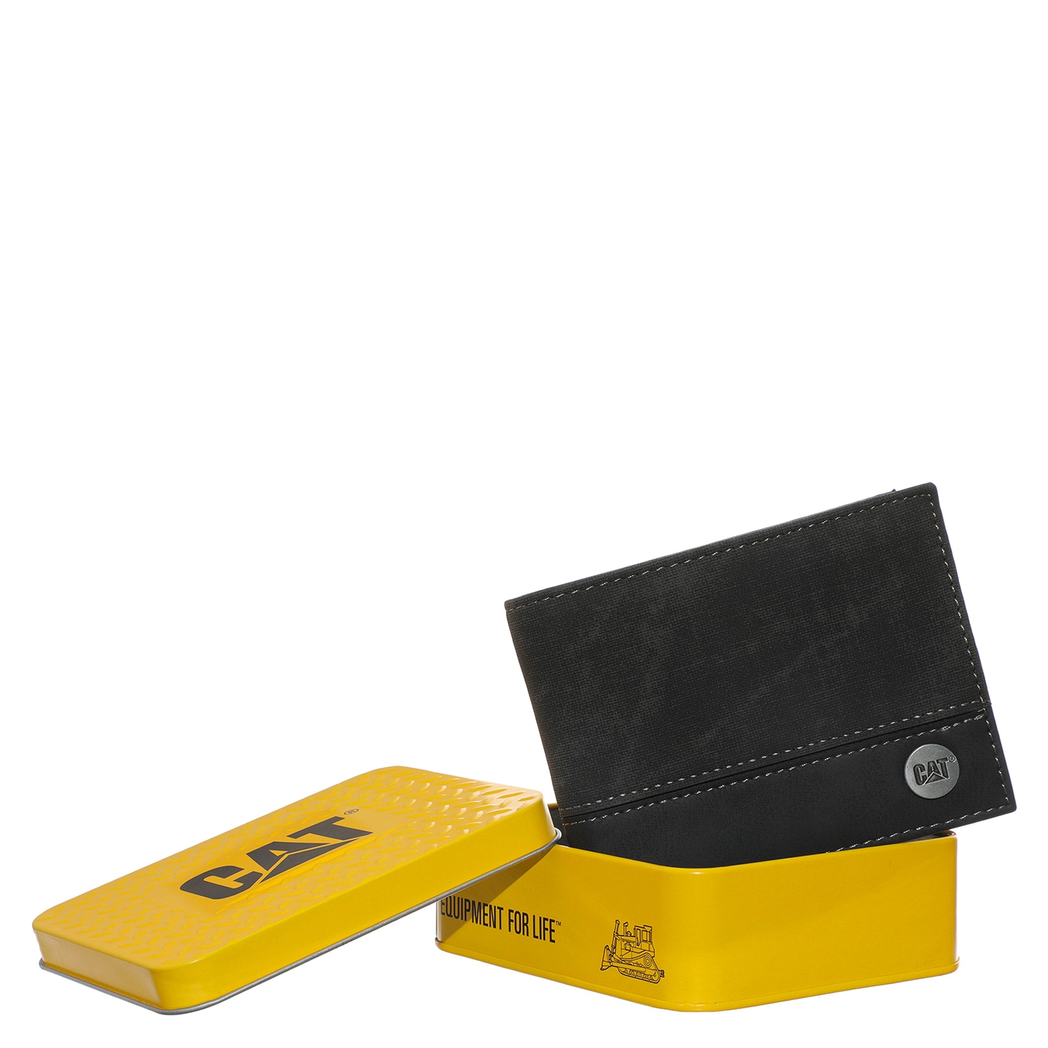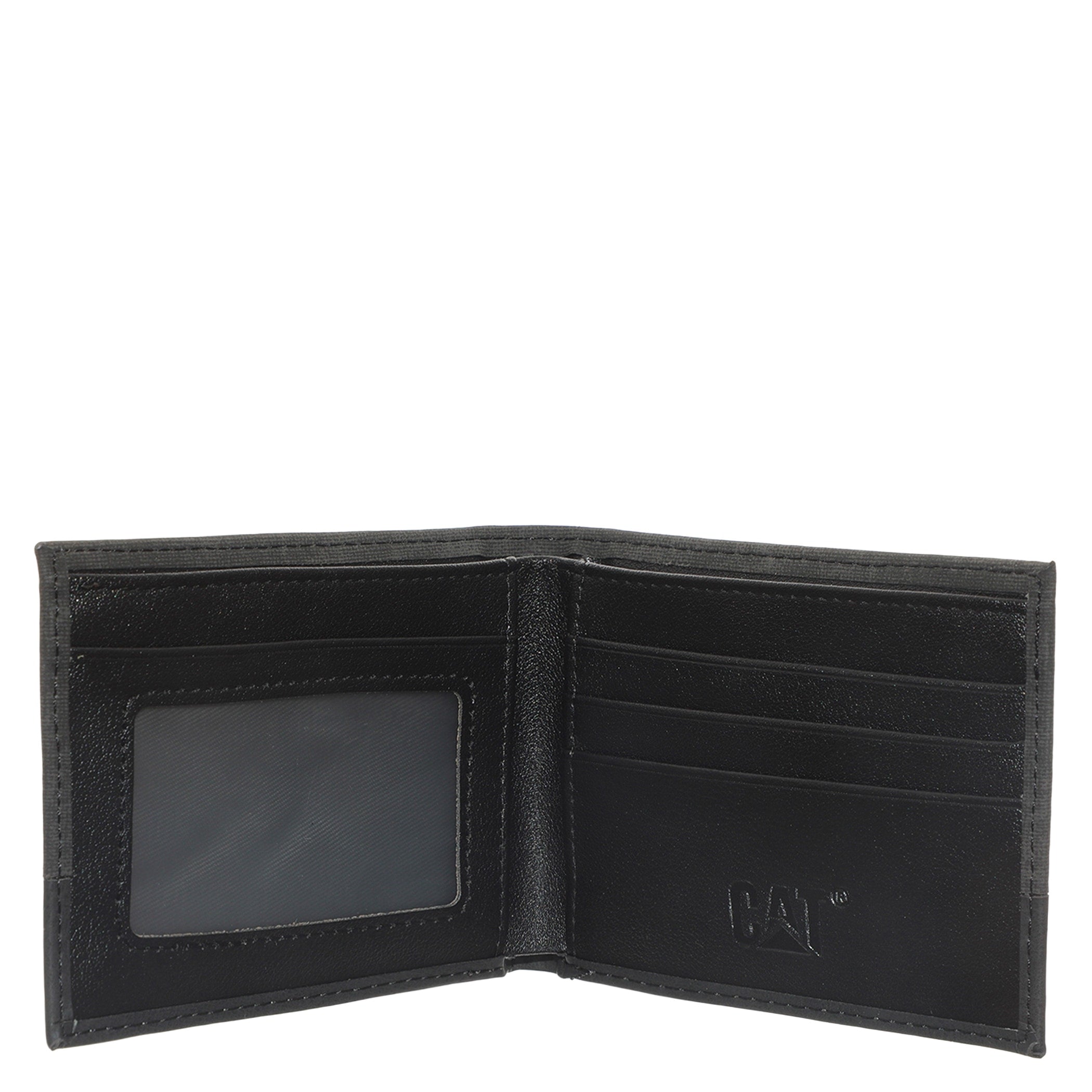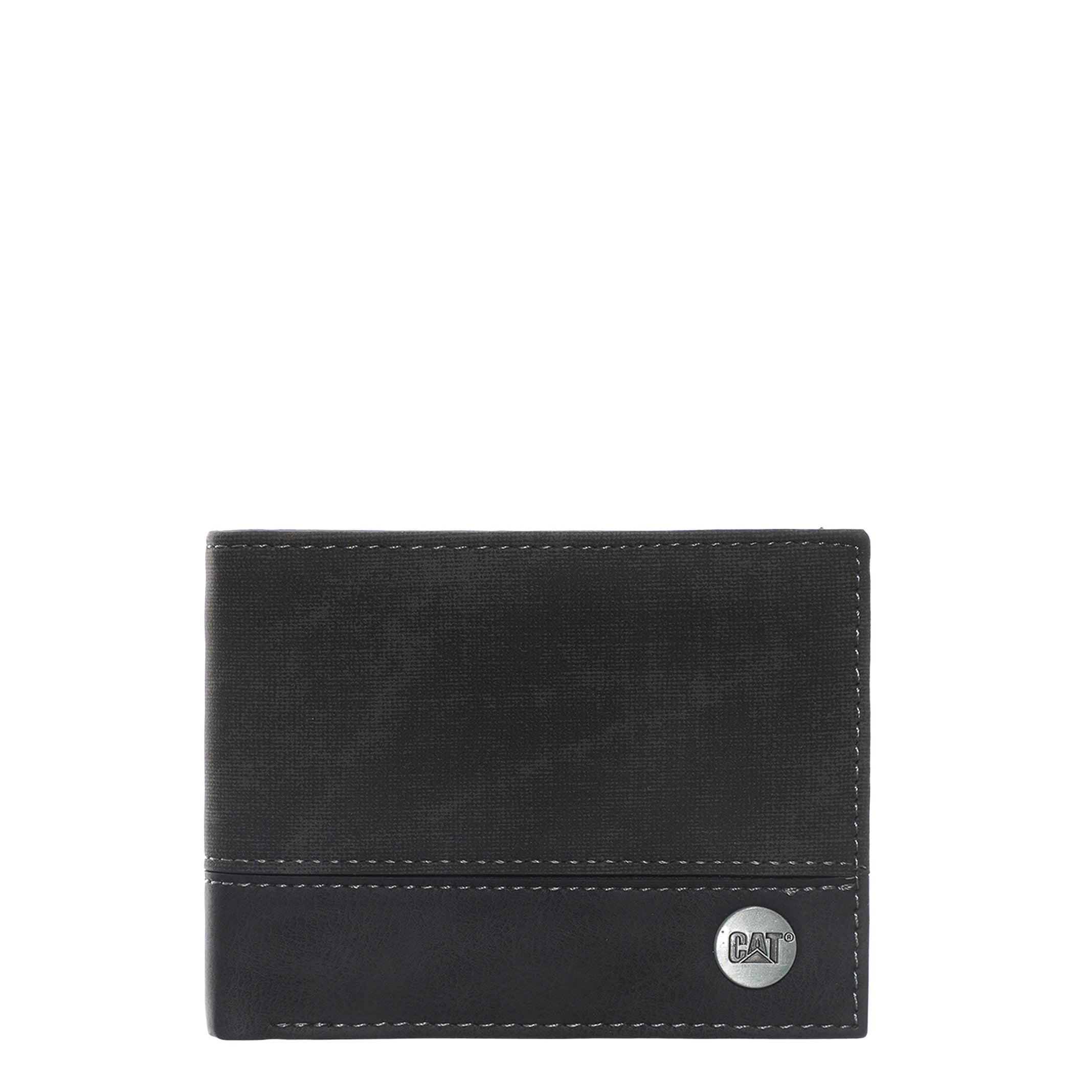 Cartera Cat para hombre elaborada en material sintético negro y diseño clásico de doble pliegue. Presenta una pequeña placa metálica con el logo de CAT en la parte inferior y es un accesorio funcional y atemporal, ideal para organizar tus tarjetas y billetes de forma segura y con estilo.