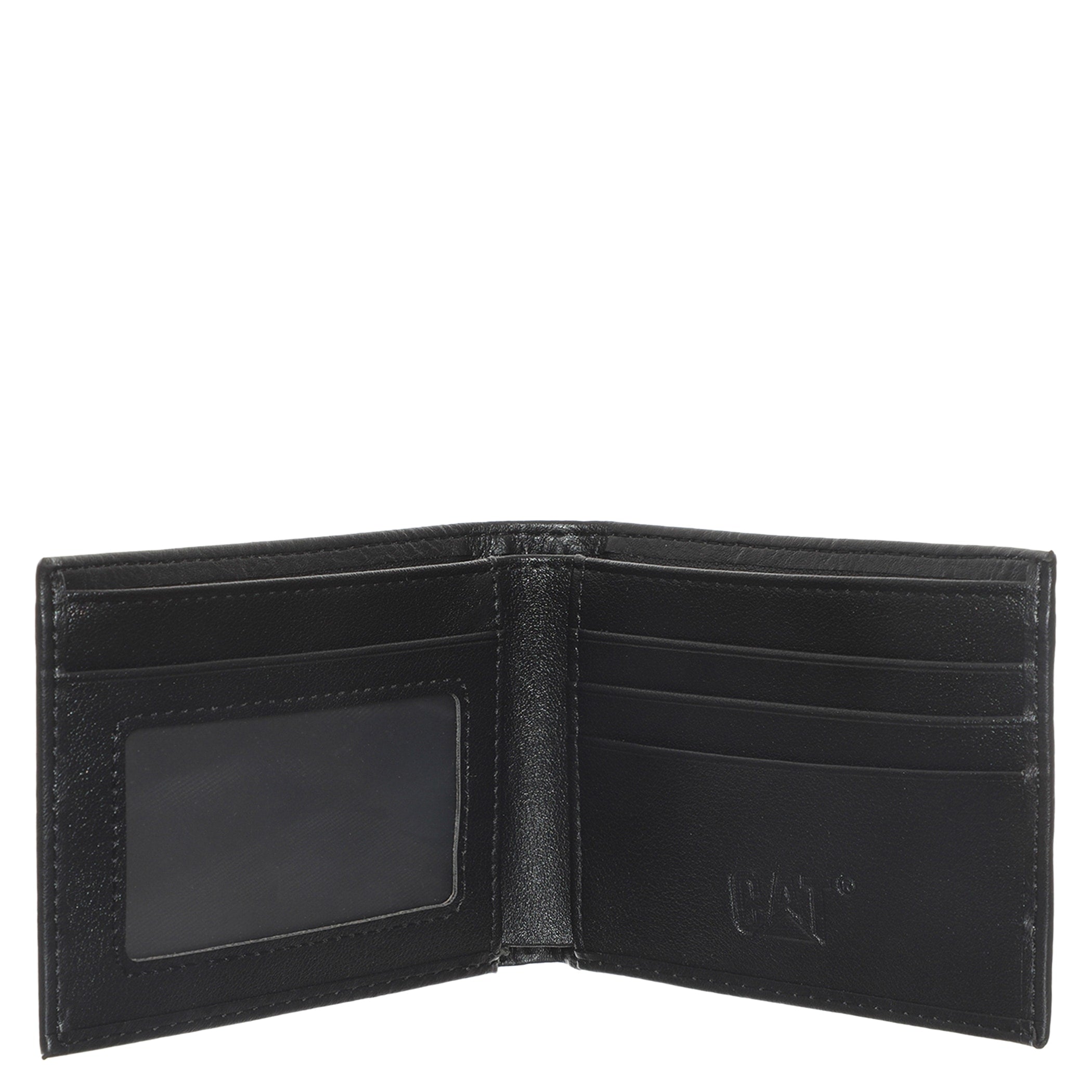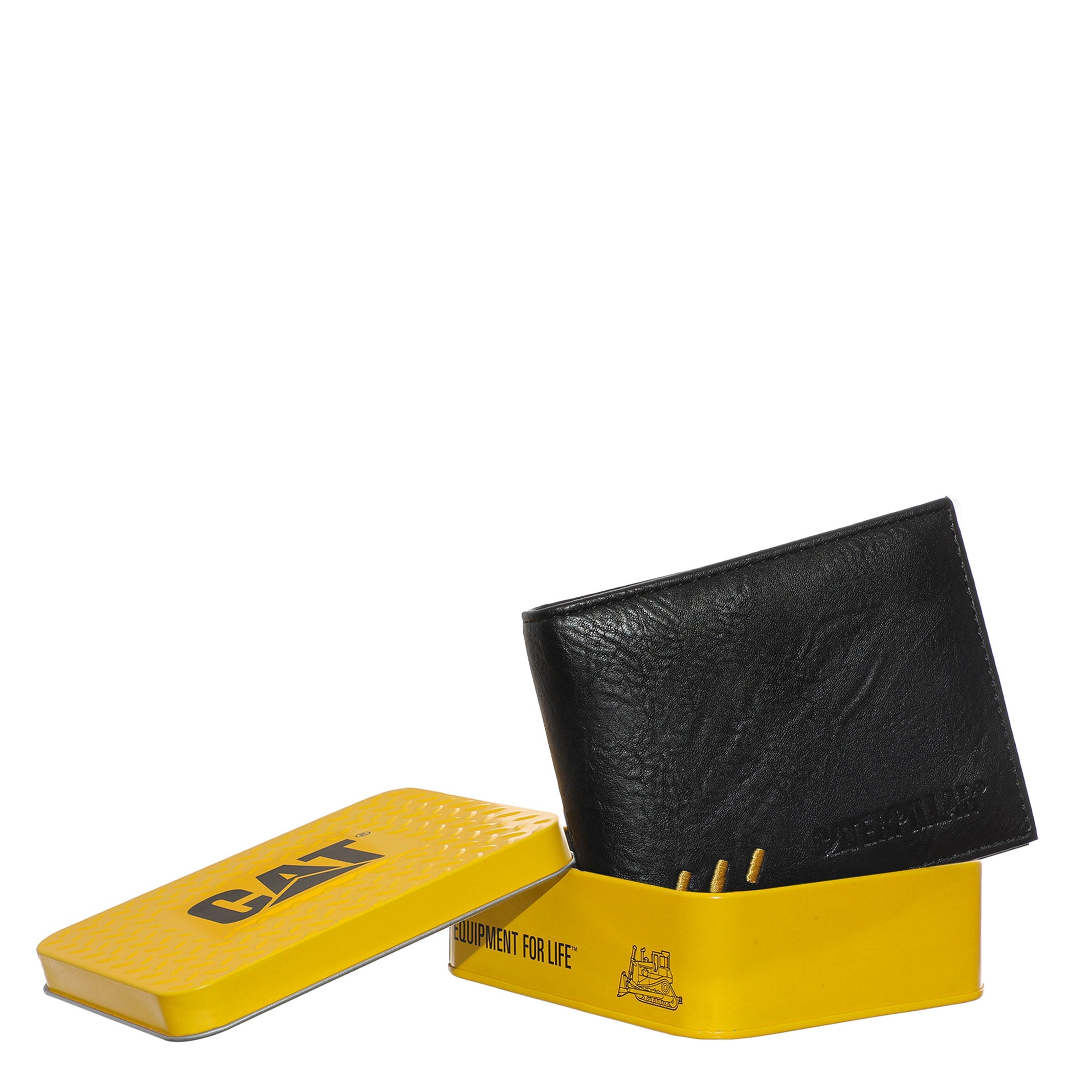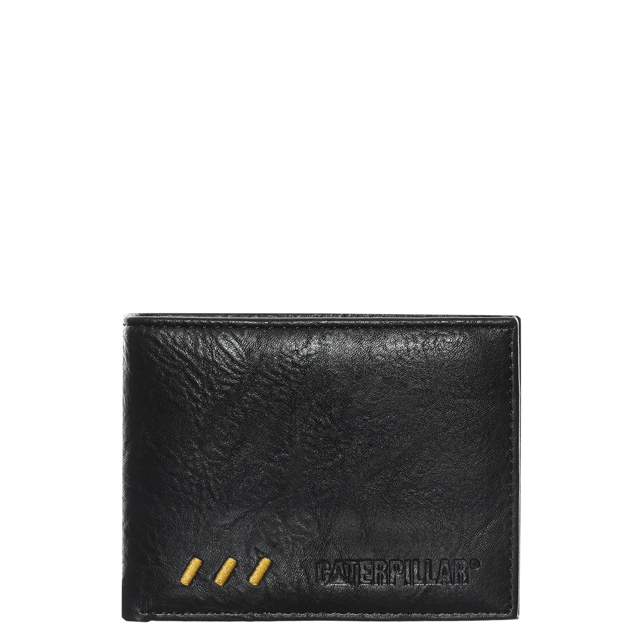 Cartera Cat para hombre elaborada en material sintético negro, presenta un diseño moderno y minimalista con detalles distintivos. En la parte frontal, tiene el nombre ""CATERPILLAR"" grabado en relieve y tres barras decorativas en color amarillo. La cartera tiene un acabado texturizado que le da un aspecto sofisticado, ideal para organizar tus tarjetas y billetes de forma segura y con estilo.