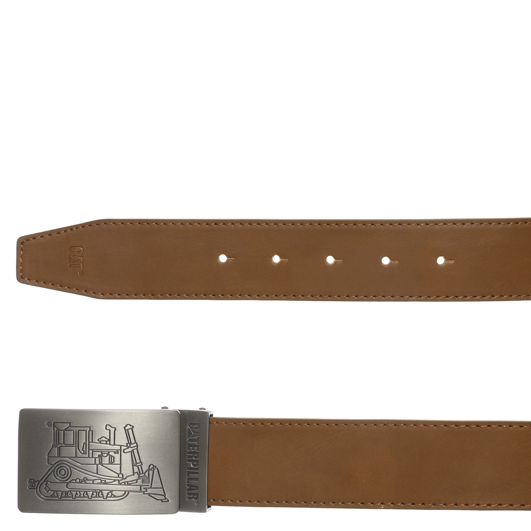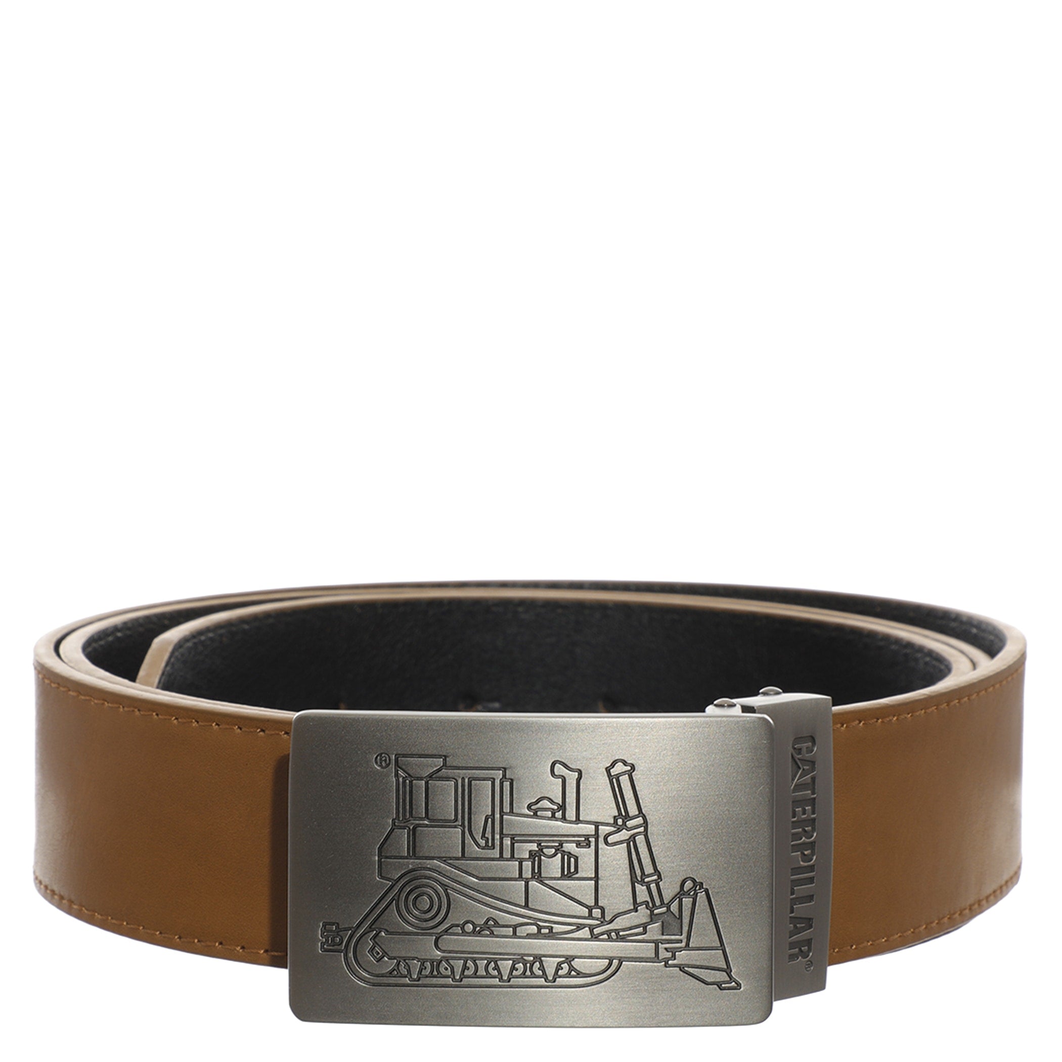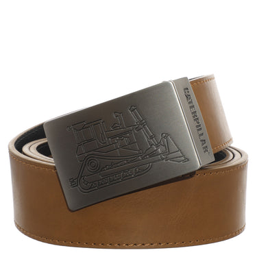 Cinturón Cat para hombre elaborado en material piel color café de diseño clásico con hebilla plateada. La hebilla es el elemento central, ya que presenta un grabado detallado de una de las icónicas máquinas de construcción de la marca y el logo en la parte lateral. Es un accesorio versátil con un toque distintivo, ideal para complementar atuendos casuales.