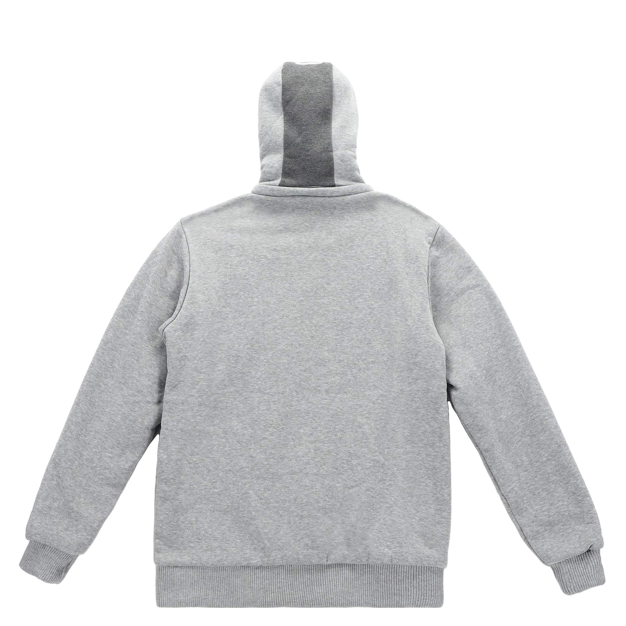 Su diseño en tono gris claro con cierre completo al frente combina funcionalidad y estilo, mientras que la capucha ajustable con cordones brinda protección extra contra el viento. Los bolsillos frontales tipo canguro añaden practicidad para mantener las manos calientes o guardar objetos pequeños.